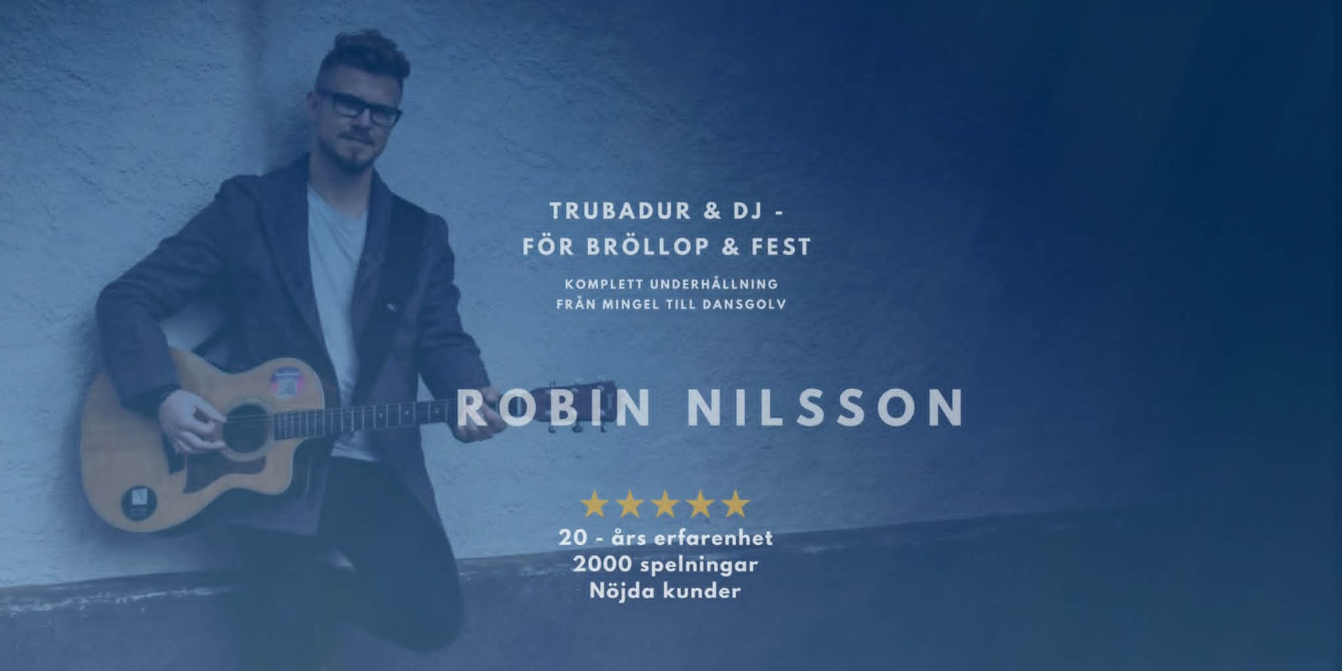 Vi bokade Robin för vår bröllopsdag. Först spelade Robin under mingel före och efter vigseln och gästerna var supernöjda. Även en festspelning efter middagen som var helt otrolig, han fick med sig alla 80 gäster på dans och sång (trots ca 3 timmars senare spelning än planerat😅). Han anpassade också sin musik och låtval efter stämningen i publiken. Kan verkligen rekommendera Robin för alla typer av event👍
